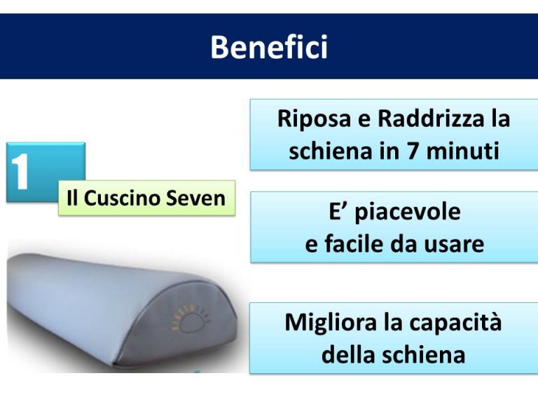 Ha l’obiettivo di aiutarti a eliminare da solo questi disturbi, usando un piacevole cuscino per alcuni minuti al giorno. Il Programma è composto da video, audioguide, informazioni ed esercizi da svolgere anche con il Cuscino Seven, grazie al quale sentirai la tua schiena allegerita! Più dritta! Più facilmente! Senza dover più dipendere dai farmaci! Senza più dipendere da massaggi! Per alleviare il macigno appoggiato alla tua schiena.